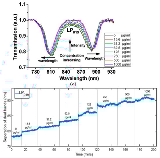 - Liu, L.; Marques, L.; Correia, R.; Morgan, S.P.; Lee, S.W.; Tighe, P.; Fairclough, L.; Korposh, S. Highly Sensitive Label-Free Antibody Detection Using a Long Period Fibre Grating Sensor. Sens. Actuators B Chem. 2018, 271, 24–32. [Google Scholar] [CrossRef]