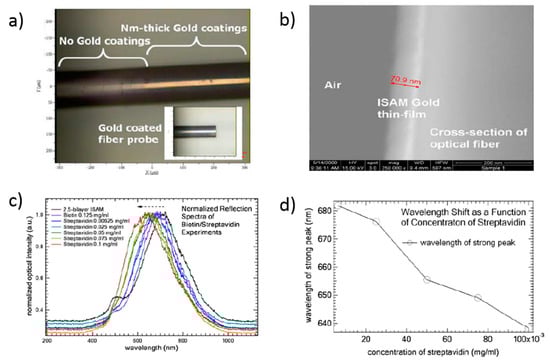 - Kaul, S.; Chinnayelka, S.; McShane, M.J. Self-assembly of polymer/nanoparticle films for fabrication of fiber-optic sensors based on SPR. In Optical Fibers and Sensors for Medical Applications IV; The International Society for Optical Engineering: Bellingham, WA, USA, 2004; Volume 5317, pp. 224–233. [Google Scholar]