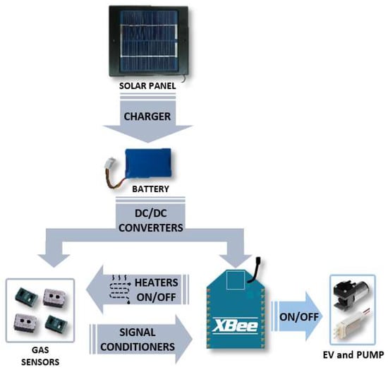 The block diagram of the module is depicted in Figure 2. Through a battery charge management controller, a solar panel can power the nodes in order to get more autonomy. In turn, a 2050-mAh battery powers the XBee radio frequency module and the gas sensors using DC-DC converters of 3.3 V and 5 V. Operational amplifiers and low-pass filters are used to condition the signals from the gas sensors. These signals are then transmitted to the XBee module, which is responsible for the wireless communication. In addition, it also controls the power of the sensor heaters by using a PWM (pulse width modulation) signal, and disables them when they are not used in order to reduce consumption. Finally, with the purpose of performing measurements under controlled conditions in the laboratory, a pneumatic pump and an electrovalve (EV) can be connected. Its connection/disconnection and power supply are managed by the XBee module as well.