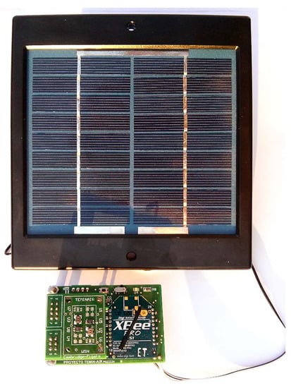 Nodes are optimized to support the integration of different gas sensors. The main board enables adding two resistive sensors with the TO-5 package. However, it has a connector that allows plugging in different custom boards containing up to four sensors. For the results presented in this paper, the array is composed by four MOS gas sensors: CCS801 and CCS803 (ams, UK), and two TGS8100 sensors (Figaro, Japan). Figure 3 shows a picture of the real designed node powered by a solar panel.