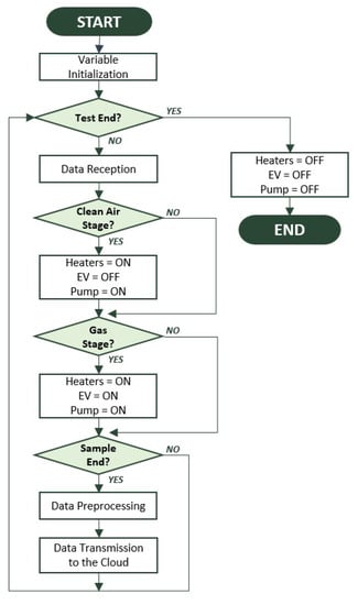 A flowchart of the controlled measurement program is shown in Figure 4. In it, after initializing the variables, whether the experiment has come to an end is checked, i.e. whether the desired number of measurement cycles has been carried out. Each cycle consists of the reference gas measurement and the target gas measurement phases. If the experiment has not been completed, the data is received from the sensor nodes in the network. Then, depending on the phase, the analysis stops, and the states of the pump, the electrovalve (EV), and the heating resistances of the sensors (heaters) are modified. That is, in the reference gas measurement phase, the electrovalve is switched off, the pump operates at the determined power, and the sensor heaters are also activated at the determined power. Otherwise, in the target gas measurement phase, the electrovalve is activated, and the pump and the sensors heaters are maintained at the corresponding powers.