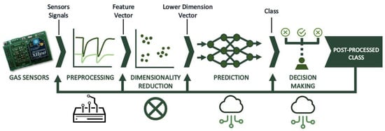 As explained above, the implementation of pattern recognition and artificial intelligence techniques is required in order to perform contaminant detection tasks. As shown in Figure 5, this process can be divided into four stages [43]: feature extraction and signal preprocessing, dimensionality reduction, prediction, and decision making. In addition, the initial block in this figure represents the whole multisensor system, whose output are the temporary measurements made on several samples. For the present system, the preprocessing stage is implemented at the gateway, dimensionality reduction is not required (although it is included in the results section for better visualization of the data), and the prediction and decision-making stages are performed in the data cloud.