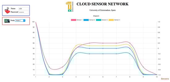 As it can be seen, the upper left side is divided into two sections: access login and node selection. The first one allows web users to introduce their access information, while the second enables the selection of a specific node from the sensor network. The central area is used for presenting a linear graph reporting on the last measurements taken. This graph presents a different colored line for each sensor, and it is updated every second. The information retrieved is also classified in real-time. For example, Figure 7 shows the classification information provided by the e-learning classification service when the last measurements were taken. In this figure, the x-axis represents the time in seconds, whereas the y-axis shows the preprocessed value detected by the four MOS gas sensors integrated in the device, as described in Section 2.1.