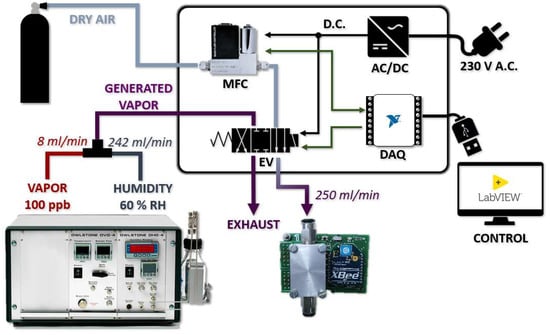For this purpose, different compounds have been generated at four different concentrations (10 ppm, 15 ppm, 20 ppm, and 25 ppm) by using permeation tubes, which are polymeric tubes that contain an analyte in solid, liquid, or gaseous state, and are sealed and crimped at both ends. This analyte passes through the walls of the tube at a constant speed under given temperature conditions. It is then mixed and transported by a flow of a carrier diluent gas. Therefore, a one-mL permeation tube has been prepared for each compound. From them, calibrated vapors have been generated using a generating unit (Owlstone OVG-4). This unit also generates a controlled flow of humidity that is added to the original flow. A switch between the reference gas and the target gas has been designed for use with the calibrated vapor generation unit. It consists of two gas inlets (vapor generator and dry air), a mass flow controller responsible for regulating the flow of the reference gas, and an electrovalve whose purpose is to switch the gas circulating in the sensor cell. When the reference gas is passed through the sensor cell, the flow corresponding to the vapor generator, which is continuous, is vented. The operation of the system is controlled through a data acquisition card (with an application developed in LabVIEW), and is powered with 230 V (AC). A diagram of the measuring system is shown in Figure 8.