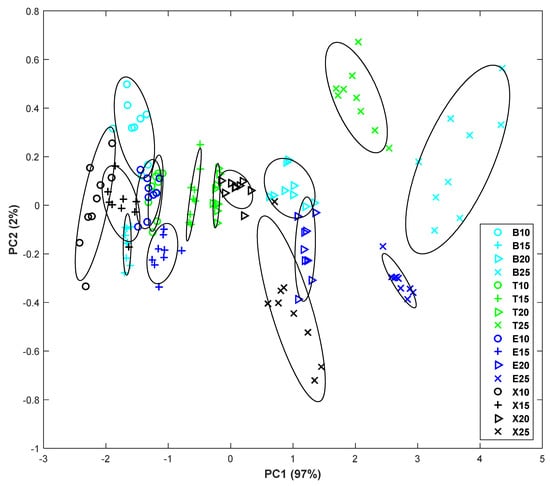 Then, PCA is carried out to study the resulting distribution of measurements in a graph. The first two principal components for the different concentrations (10 ppm, 15 ppm, 20 ppm, and 25 ppm, respectively) are shown in Figure 10. The different compounds have been represented in different colors to facilitate the reading of the plot: benzene in light blue, toluene in green, ethylbenzene in dark blue, and xylene in black. In the same way, the different concentrations are represented with different symbols. If attention is focused only on groups of equal concentration, it can be noticed that as the concentration increases, the areas are more distinguishable. Thus, in the first case (10 ppb), there is a high overlap in the areas of benzene, toluene, and ethylbenzene. Otherwise, in the graph corresponding to 15 ppb, the overlap is reduced to the benzene and xylene zones while, in the third PCA (20 ppb), there is only a small partial overlap between the ethylbenzene and xylene zones. Finally, in the case of 25 ppb measurements, it can be observed that different areas concerning each compound are clearly separated. By observing the plot in a general way, apart from the overlaps described above, some more appear between compounds of different concentrations: X15 with X10 and E10, T10 with E15, and E20 with X25. However, they are minor overlaps, or only very close approximations. Overall, it suggests that the different areas could be differentiated in most cases.