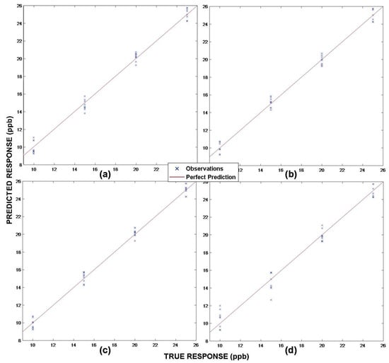 The dimensionality reduction stage is omitted due to the limited size of the data matrix. With respect to the prediction stage, regression tasks are carried out. A Matlab (Mathworks, Natick, MA, USA) toolbox (Statistics and Machine Learning Toolbox™) has been used for this purpose. The SVM technique applied to regression (SVR) is employed. In the implementation of this technique, the kernel function used is a polynomial function of grade three. In Figure 11, the predicted responses versus the true ones are represented for each of the BTEX compounds. It can be noticed that in all of the cases, the maximum errors are around ±1 ppb. The xylene data are those that are farthest from the true response, which can lead to errors between the values referring to concentrations of 10 and 15 ppb.