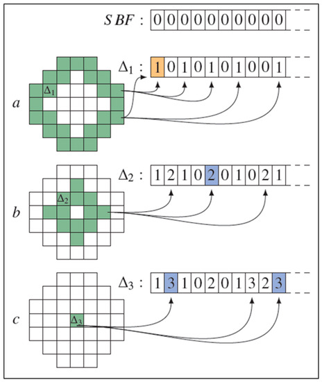 Spatial bloom filter (SBF). (a) Two BF elements joined to ∆1 are processed through the use of the hash functions, leading to six one-value elements that can then be written into the SBF. The same method can be used in (b) and (c).