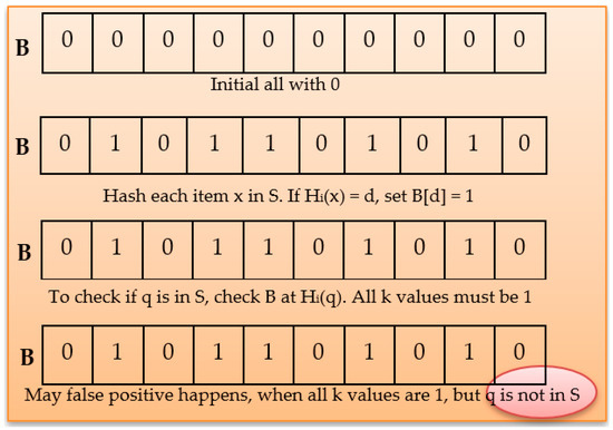 The BF facilitates the testing of a secure membership and never discloses more than a bit of data concerning this set. As depicted in Figure 3, if A is an element that presumes a set S, then the BF generates a probabilistic system that can be used in determining if “q is not a component of S” and H(q) = 0, which means no false negatives occurred. Thus, the assertion is accurate. When all k values in the hash functions are 1, but the item q is not in S, false positives occur. B denotes bloom filter; H denotes hash function [58].