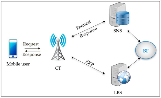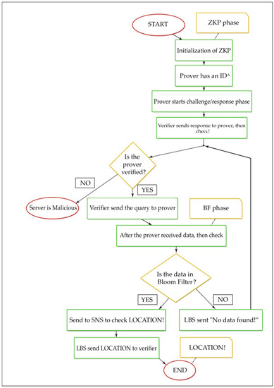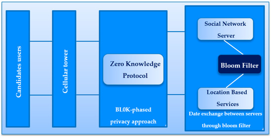In the proposed approach, we investigated two protocols to protect privacy: ZKP and BF. The aim of this approach is to decrease the data leakage and preserve the user’s privacy queries in LBS. So, the combination of BF and ZKP can be fully used using a two-stage method as shown in Figure 4.