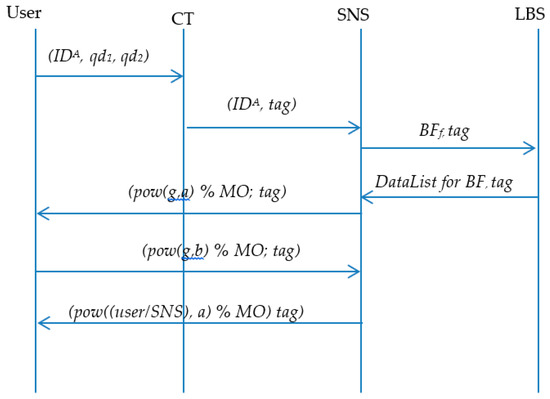 - User/server: The user and SNS can send a particular query if there is something in the LBS server’s range.