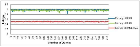 In a worst case scenario, an unauthorized LBS provider, through multiple attacks, is able to obtain a user’s complete location information history. A potential solution to this risk is to use the BL0K capability to mask any sensitive data exchanges occurring during communication of location-sharing procedures. We showed that the performance of the BL0K framework, using a dataset, is very close to the real-world queries by comparing its performance with the BLOT in terms of privacy (entropy). As shown in Figure 11, the computation performance of BL0K is the best because it requires the least time in the execution of one complete query because the data flow in BL0K is less than in BLOT and BMobishare.