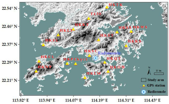 The HK Satellite Positioning Reference Station Network (SatRef) consists of 18 CORS, including 16 reference stations and two integrated monitoring stations. These stations constantly receive GNSS data. Observations and meteorological data from these stations are freely downloadable from the HK Survey & Mapping Office (https://www.geodetic.gov.hk/smo/index.htm) in RINEX format. These data can be used for high-precision positioning work and as fundamental data for retrieval algorithms in the remote sensing of tropospheric water vapor content. Water vapor products with high temporal and spatial resolution can be obtained given the continuous operation of the network and observation stations throughout HK. In this work, 17 out of 18 stations were selected for analysis and comparison given the continuity of observational and meteorological data. The details of these sites, including station name, geodetic coordinates, and elevations, are shown in Table 1.