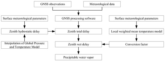 The PWV retrieval processing flow is shown in Figure 2. The software obtains the zenith total delay (ZTD) after processing GNSS observations and meteorological data. The empirical model is used to calculate the zenith hydrostatic delay (ZHD) on the basis of the measured or interpolated meteorological parameters. The conversion coefficient II is obtained by inputting the surface meteorological parameters in the regional model for the estimation of the weighted mean temperature (Tm), which is used for a series of calculations. Then, the PWV is calculated by multiplying conversion coefficient II with zenith wet delay (ZWD). The details of the above steps are described in the following sections.