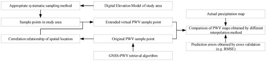 The proposed improved interpolation steps are shown in Figure 3. A series of points with three-dimensional coordinates, which are selected through the systematic sampling approach from the point cloud data of the DEM, establish links with original sample points to yield the virtual points with PWV values on the basis of the correlation between PWV values and geographical location. The original sample point and the virtual sample are adopted in the spatial interpolation method applied to construct the GNSS-derived PWV map. Finally, the qualities (i.e., the rationality and prediction performance) of interpolation is evaluated by actual precipitation map and prediction error obtained by cross-validation. The following sections describe these processes in detail.