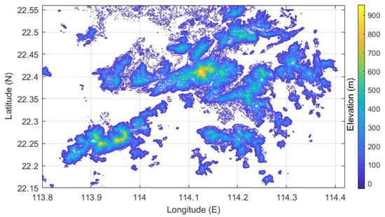 DEM is a continuous surface that represents ground elevation in the form of a series of ordered numerical arrays [32]. DEM data with a 3 arc-second resolution provided by the NASA Shuttle Radar Topographic Mission (SRTM, version 3) was adopted in this study. The vertical resolution of the DEM data was 90 m. The data used in this study are available on the website of the U.S. Geological Survey (https://dds.cr.usgs.gov/srtm/version2_1/SRTM3/). QGIS software (version: 2.8) [33] was used to clip out a rectangular area wherein HK was located at 113.80°E–114.42°E and 22.15°N–22.56°N. Then, the software was used to transform the clipped data into the xyz grid data format, which is a three-column matrix that comprises original geographic coordinates of DEM data. In this case, x, y, and z represent longitude, latitude, and ellipsoidal height, respectively. Next, these data were reorganized for display, and the SRTM DEM map of the study area is shown in Figure 4.