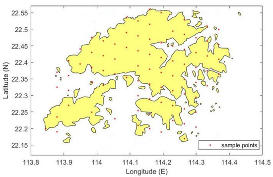 Only 17 stations have PWV information (as shown in Figure 1) that can be interpolated for the construction of water vapor distribution maps for HK. Moreover, the spatial distribution of these stations was insufficiently dense and uniform and was too coarse to reflect the dynamic fluctuations of water vapor. Thus, PWV information from existing original sample points to virtual sample points with a uniform distribution (Figure 5) must be extended through a reasonable method on the basis of the relationship between PWV values and the geographical position of 17 original points. The PWV values calculated with the GNSS observation data and meteorological data of 17 stations for the period of 0:00 on August 19, 2017 to 0:00 on September 1, 2017 (the sample interval was half an hour and provided 637 results in total) were compared with their elevation information (referred to ellipsoidal height in this paper) to explore the correlation between PWV and elevation. Figure 6 shows the number and percentage of points in the range of correlation coefficients (CCs). The CCs of 70.96% of the sample points exceeded 0.7, those of the remaining 17.42% were in the range of 0.5 to 0.7, and those of 11.62% of the sample points were less than 0.5. These results indicate that the PWV values and station elevation of more than 88% samples were significantly correlated. Therefore, extending PWV information to virtual sample points based on the correlation between station elevation (or horizontal position information) and PWV was reliable. The steps involved in extending PWV information are as follows:
