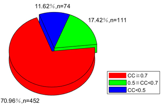 Pie chart of the CCs between PWV and ellipsoidal height of original points.