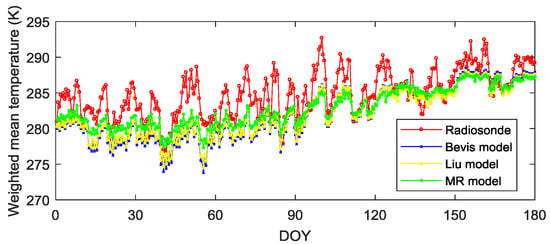 Comparison of the Tm time series obtained from the numerical integration method (by using radiosonde data), the MR model, Liu model, and Bevis model for the period from DOY 1 to DOY 180, 2017. The radiosonde station acquired data at 00Z and 12Z UTC on each day.