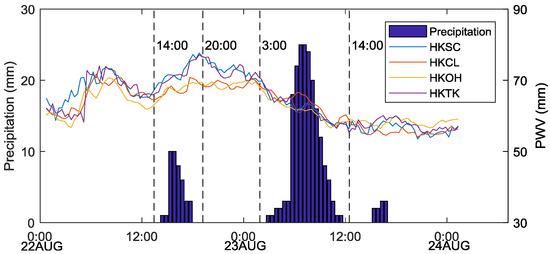 Relationship between the PWV (line) of four selected stations and average precipitation in HK (histogram) for the period during 22–24 August 2017.