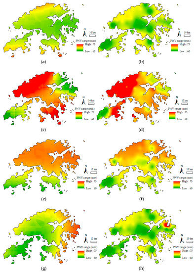 In Figure 10a–h, the PWV distribution maps generated by Schemes I and II indicate that the PWV in the central area was lower than that in the northern and northwestern fringe areas. Mea3nwhile, it can be found that the central area with lower PWV values than surrounding parts, however, its elevation is significantly higher than in others (recall Figure 4). This finding consistent with the previous research [41] that the PWV tends to decrease with increasing elevation. Similarly, the PWV in the central of the island in the southwest of HK is relatively lower than other parts in accordance with Figure 10b,d,f,h. On the contrary, the elevation of the central part is higher than the rest of the island. Nevertheless, the phenomenon, which the PWV values in the central region are lower than in the rest part of the island, shown in Figure 10b,d,f,h obtained from Scheme II is not easy to find in corresponding Figure 10a,c,e,g obtained from Scheme I. In consequence, Scheme I provided the general distribution map of PWV that was influenced by the sparsity of original sample points. In contrast, Scheme II, with many virtual sampling points provided the detailed spatial distribution map of PWV. Furthermore, the interpolation results of Scheme I (in Figure 10a,c,e,g) demonstrated the dynamic change of PWV during the period (August 22 to 24, 2017). The PWV in the study area was low at 14:00 on August 22, 2017 and reached than 70 mm at 20:00 on the same day. Besides, the PWV was lower in the central and southern but higher in the northern and northwestern at 3:00 on August 23, before heavy rainfall. The PWV in HK deeply deceased after heavy rainfall at 14:00 on August 23, 2017. Thus, the PWV in the central and southwestern was less than that in the northeastern. In addition, the PWV map generated by the LZ method (Scheme II) show a similar changing trend and it is significant it has more details of PWV distribution.