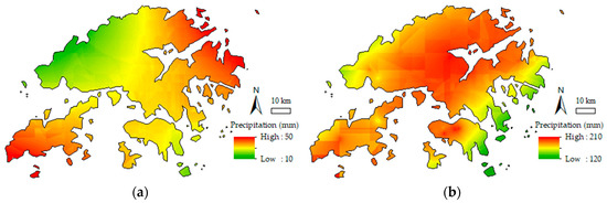 For evaluating the performance, precipitation distribution maps generated by actual cumulative rainfall was compared with the interpolation results of the two schemes. Figure 11 shows the distribution of accumulated precipitation in the period from 14:00 to 20:00 on August 22, 2017 and between 03:00 and 14:00 on August 23, 2017. The total rainfall in the whole study area ranged from 14 mm to 46 mm during the period between 14:00 and 20:00 on August 22 and from 129 mm to 201 mm during 03:00 to 14:00 on August 23, 2017. Figure 11a shows increased precipitation in the southwestern islands and northeastern regions, and Figure 11b indicates that precipitation increased in the central mountainous area and southwestern islands. Besides, Figure 9 provides the rainfall map in August 2017 released by the HKO (isohyets are in mm), which shows that rainfall mainly localized in the central, northeastern, and southwestern area in the HK. Figure 9 and Figure 4 reveal that the area with higher elevation results in higher precipitation, and vice versa. In other words, there is a spatial auto-correlated effect within the precipitation and elevation in the HK. However, we also find that the area with heavy precipitation (the elevation is higher than the surrounding) has smaller PWV than the surrounding. The research of Goovaerts [42] may provide an explanation for the phenomenon. Water vapor (expressed as PWV) condenses due to adiabatic cooling caused by terrain uplifting, eventually forming precipitation. Therefore, the interpolation results of the two schemes presented in Figure 10 indicates that the PWV distribution interpolated by Scheme II is closer to the real than that interpolated by Scheme I.