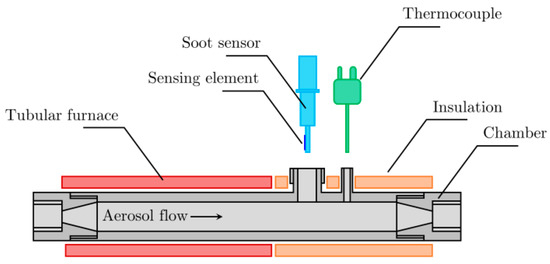 Finally, the mono-disperse aerosol was driven to the 9 mm internal diameter soot sensor chamber (cf. Figure 2)—heated by a tubular furnace at the temperature of —leading to a Reynolds number (4). The flow was drained by a GilAir pump at . A simple heat exchanger made of an 1/4 inch external diameter and 50 cm long stainless steel tube was used to decrease the temperature of the heated gas to the ambient temperature. Moreover, a High Efficiency Particulate Air (HEPA) filter was used to protect the pump from potential degradation caused by the soot aerosol.