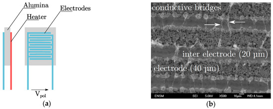 (a) Illustration of the resistive soot sensor; (b) Typical scanning electron microscopy of the interdigitated electrodes [15]. It shows the soot bridge-like microstructures linking the electrodes after the percolation time is reached.
