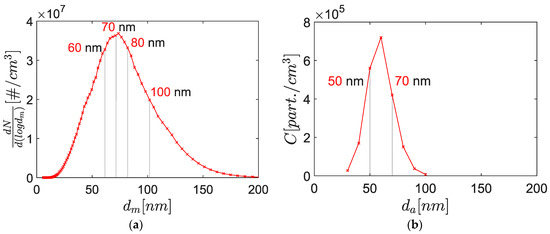 Finally, the particle size distribution was measured both with an electrostatic classifier and an aerodynamic classifier as mentioned before, and shown on Figure 4. It can be seen that the median mobility diameter and the median aerodynamic diameter were different (respectively 70 nm and roughly 60 nm) as well as the standard deviation. This can be explained by the relation between the aerodynamic diameter and the electric mobility diameter which is not linear because of the Cunningham slip correction factor . Indeed, the relation between the mobility diameter, the volume equivalent diameter and the aerodynamic diameter is given by McMurry et al. [24]: