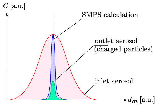 Illustration of the working principle of an aerosol classification by electrostatic technique. The blue area represents the concentration computed by the SMPS algorithm, based on the Boltzmann equilibrium. The effective aerosol (i.e., the particles sent to the sensor chamber) is the green area.