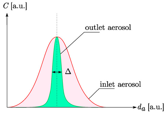 The resolution of the AAC is defined as the set point divided by the full width half maximum of the instrument’s transfer function in the size domain [27]. It can be expressed as a function of which represents the width of the size distribution function at mid concentration (cf. Equation (3)):