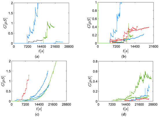 In Figure 9, it can be seen that the sensor signals had a significantly different shape, closer to the typical responses observed in previous studies performed at high concentrations and for poly-disperse aerosols [14]. Nevertheless, a zoom on the signal close to the percolation time showed that the conductance was still made of random steps with a higher frequency (cf. Figure 9b). Several negative steps were observed and could be attributed to bridges blow off [30]. What is more, the conductance decreases after each step seemed to be lower or nonexistent and the height of the steps (approximately 0.01 µS) was significantly lower compared to the response to the DMA classified aerosols. Also, the reproducibility of the signal was improved.