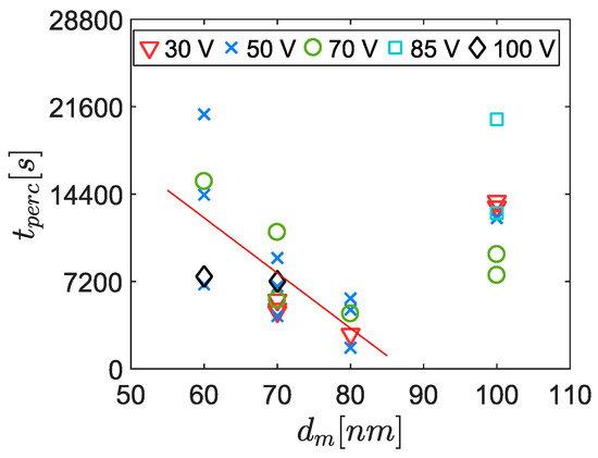 Overview of the percolation time for different mobility diameters and concentrations. The red line is the correlation between the averaged percolation times and the mobility diameters, without taking into account the 100 nm diameter measurements (, ).