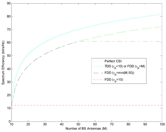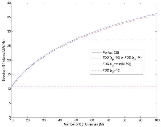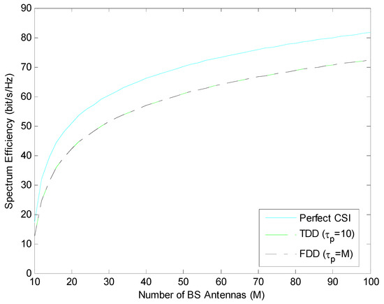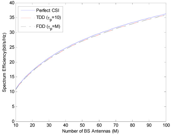 Figure 5, if the number of antennas in the base station increases but the length of the pilot sequence does not change, the spectrum efficiency in FDD mode will not change after a certain point. For this reason, the choice of pilot length should be taken into consideration when selecting FDD mode. In this case, FDD mode could be selected if the number of antennas in BS is less than the length of pilot sequence. But if the number of antennas in BS is more than the length of pilot sequence, TDD mode could be selected.