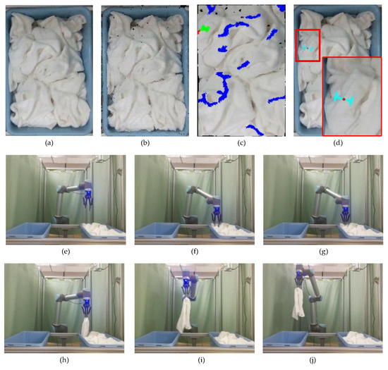 The complete process of the method: (a) the RGB image from Realsense D435; (b) the point clouds of the white towels; (c) the appropriate grasp point on the candidate convex wrinkle; (d) the projection of the grasp pose on the image; (e) the robotic arm reaches the pre-grasp position; (f) the robotic arm reaches the grasp position; (g) the robotic arm closes two-finger gripper; (h) the robotic arm picks a towel; (i) the robotic arm moves the towel from the right laundry basket to the left laundry basket; (j) the robotic arm stands by placing.