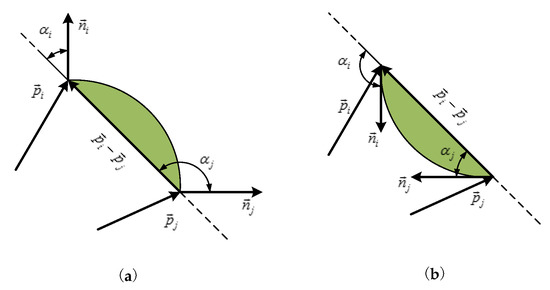 The idea of the concavity and convexity criterion mainly comes from LCCP [24]. It is mainly based on the relationship between the normal vectors , and the vector () to judge whether the surface between the point and the point is convex or concave, as shown in Figure 3. If the angle between the normal and the vector () is smaller than the angle between the and the vector (), there may be convex surface between the point and . Conversely, it is a concave surface. As mentioned in LCCP [24], there exist noises from the obtained RGB-D data. It is necessary to add a bias to ignore some small concave surface, that is, to treat the small concave surface as a convex surface. In our work, we would like to find the more distinct convex surfaces. If the convex surface is not obvious, we regard it as a concave surface, which is the opposite of [24]. In this paper, for the bias , we choose .