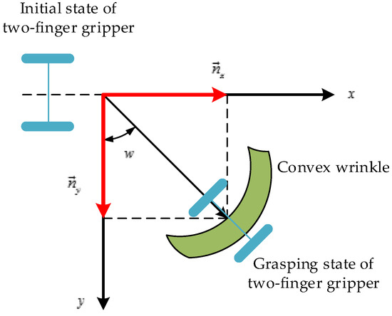 Apart from searching the grasp point, determining the grasp orientation is also important. Although there are many research works studying the grasp pose detection, for example, Refs. [25,26] which are based on the object’s point clouds to detect the grasp pose, their methods are suitable for grasping the rigid objects or soft objects with less deformation. However, the towels are highly deformed, and can be present in multiple shapes. If the grasp orientation is not suitable, the robotic arm is very likely to flatten the wrinkle and result in an air grasping. as shown in Figure 7. Then, the shape of the wrinkle will be changed, and the current grasp pose of the towels will also be changed. This will lead to a grasp failure. Thus, it is important to choose the appropriate grasp orientation. In this paper, in order to successfully pick the towels, we choose the grasp direction along the optical axis of the 3D camera and the opening direction of the two-finger gripper should be perpendicular to the wrinkle, as shown in Figure 7. The rotation angle , and the are the normal vectors of the grasp point, as shown in Figure 8. On the other hand, if the grasp path planning is not suitable, it also may lead the gripper to touching the towel. In this paper, we control the arm firstly to reach the pre-grasp position, as shown in Figure 1e, and then reach the grasp-position as shown in Figure 1f, which can avoid the problems above and improve the success rate of the grasp. In addition, it should be noted that the size of the candidate wrinkle is relatively small, so there is a limitation to the distance of the two-finger gripper. If the opening width of the two-finger gripper is too large, it will cause multiple towels to be grasped at a time. In the actual grasp, the appropriate opening width of the two-finger gripper should be selected according to the size of the object. In the experiments, we observe that the width of the wrinkles is generally less than 20 mm, so we determine the opening width of the two-finger gripper as 30 mm.