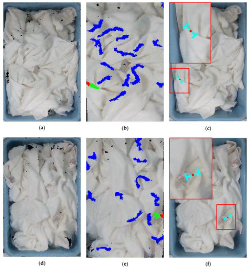 The experiments confirm that our method enables picking the towels in two different scenes. However, there are picking failures, which we analyze here. The grasp failure is mainly from grasp empty. In addition, the grasp empty is mainly due to the noise in the point clouds and not high enough accuracy of the sensor, which led to the incorrect calculation of grasp orientation, as shown in Figure 11c. Some failures come from the inappropriate grasp position where the grasp point is in the trademark, as shown in Figure 11f. Because the trademark is thin and smooth, the towel falls down after an initially successful grasp. Other failures will appear when the candidate wrinkle is located where two towels overlap.