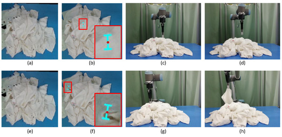 Although there are many studies on clothing manipulation, as far as I know, there is still a long way to realize its automation. For example, in the laundry industry, after washing the towels and sheets, it is still necessary to manually pick one from a pile of messy towels or sheets, and then feed it to the folding robot [12]. Like the situations in the home service industry, after washing, you can use the robot “laundroid” [13] to automatically fold and organize clothes. In the process of using it, you only need to throw several items of clothes, and the robot “laundroid” [13] will carry out the operations of grasping, spreading, folding, sorting, etc. However, it can fold only one piece of clothing at a time, and the whole process takes about 5 to 10 min. No matter what applications, picking a cloth is the essential step. In the large-scale laundry industry, the main objects of washing are towels and sheets. Thus, in this paper, we mainly study picking towels. In order to provide a more general solution, the colors of the towels are chosen to be white, and they are also made of the same materials, as shown in Figure 1a. Because there are thousands of shapes of the towels without restrictions, their perception is very difficult. In addition, these clothes are highly deformed and entangled, which brings a great challenge to picking.