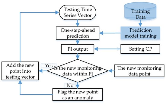 Based on the introduction of Section 3.1 and Section 3.2, the GPR and RVM model can output the mean and the variance value simultaneously. Then, the PI can be constructed with them under a certain CP. The detection flowchart based on the probability prediction model is given in Figure 1.