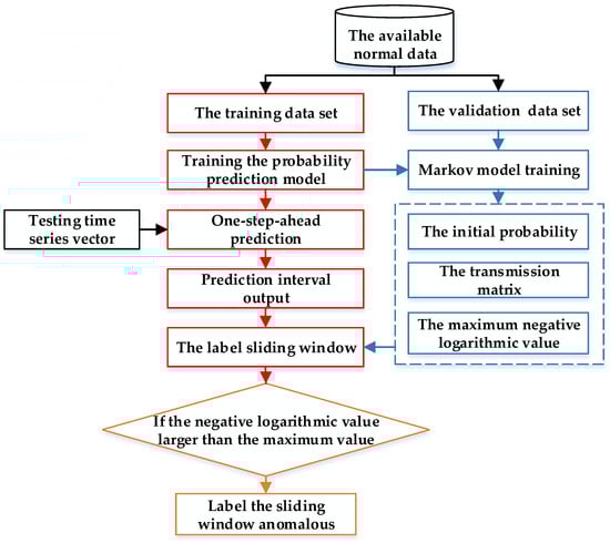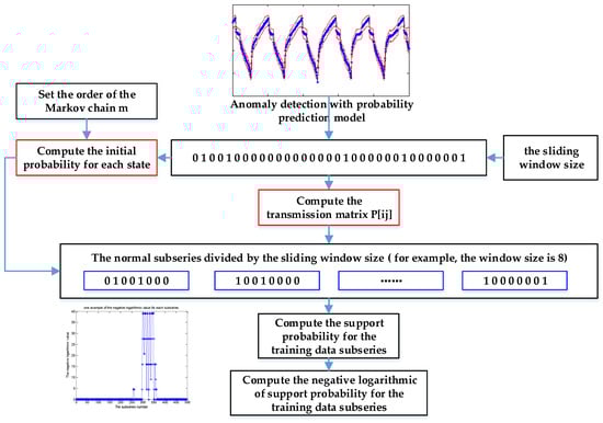 As shown in Figure 3, the original normal series are firstly processed to a label series based on the predicted results. The initial probability of normal and anomaly, as well as the transmission matrix, are derived with the label series. Then, the label series is segmented by a sliding window, where the sliding window size is set by users. In particular, the sliding window size should be larger than the number of continuous abnormal points among the training data to make the labelling strategy effective for the testing series. The support probability for each label subseries is computed with the initial probability and the transmission matrix. Furthermore, the negative logarithmic value is applied to replace the original support probability, which may be relatively small to make a comparison and figure out. Based on the training of Markov chain with the available normal data, the maximum negative logarithmic value of support probability is set as the threshold for making judgments on the testing input. There are two reasons to make this setting effective. Firstly, the maximum negative logarithmic value of support probability corresponds to the lowest support probability of a sliding window subseries. Secondly, there is a prerequisite that the validation data be adequate and normal without the interference of error points and abnormal mode. Thus, the maximum negative logarithmic value of support probability reflects the lowest probability of sliding window subseries under a normal condition. As a result, if the support probability of a testing sliding window is lower than the lowest probability of normal sliding data, namely, it has a higher negative logarithmic value of support probability than this setting threshold, it may be an abnormal mode with a higher probability.