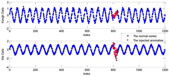 As shown in Figure 5, the blue curves marked with point are the normal series of Keogh Data and Ma Data, where the points labeled red star are the injected anomalies. Obviously, Keogh Data show an abnormal pattern in the length of period. However, the anomalies of Ma Data are mainly caused by high variance noise.