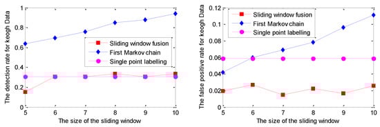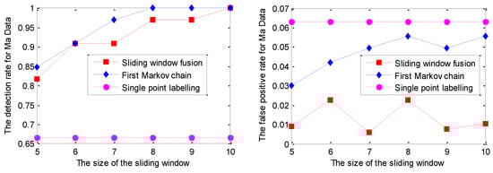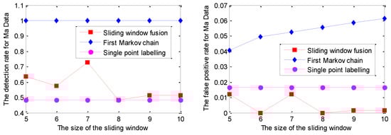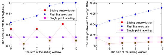 As shown in Figure 6, the DR of the Markov chain is better than that of the other two strategies. Moreover, with the increment of the sliding window size, the DR of the Markov chain has become 100% for the sliding window size of 9 and 10. Correspondingly, the FPR of the Markov chain increases with the incremental sliding window size, which is larger than that of the other two strategies. Evidently, both DR and FPR of single point labelling are not sensitive to the sliding window size.