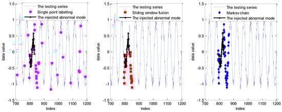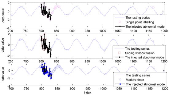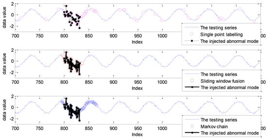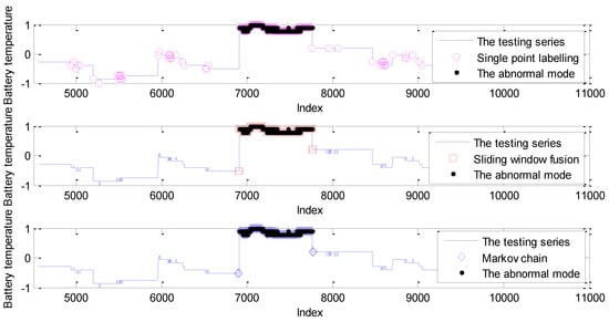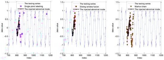 As shown in Figure 10, for the sliding window size ranging from 5 to 10, the DR of single point labelling is close to 0.5, while the DR of the Markov chain is up to 100%. In other words, the missing alarms, up to half of the abnormal mode, caused by single point labelling, are successfully identified by the realization of the Markov chain. In addition, the DR of sliding window fusion fluctuates from 51% to 72%. The FPR of the Markov chain model is also larger than the other two strategies with the influence of labelling each sliding window, not a single point. The detection results are given in Figure 11.