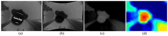 Distortion rectification and Gaussian filtering. (a) Raw depth image with distortion and overexposure; (b) corrected and rectified depth image. The objects in the scene are adjusted to the correct size. The overexposed pixel values have been corrected; (c) depth image with pixel values converted to the ground plane; (d) Visualization of pooled image. The red area symbolizes proximity to the TOF camera. Blue pixels mean far distance from the TOF camera.