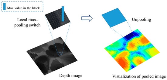 In order to improve computational efficiency and only use the most valuable information, the depth image is down-sampled into a smaller size. The process is named local pooling and the image obtained by local pooling is named pooled image. The local pooling divides the depth image into blocks in size of . Similar to max-pooling in neural network, local pooling only reserves the pixel with maximum value in the current block. Therefore, the resolution of the pooled image reduced from the original to . At the same time, the pixel value of each point of the pooled image is reduced to one hundredth of the original value as an integer. Figure 2 shows the result of pooled images.