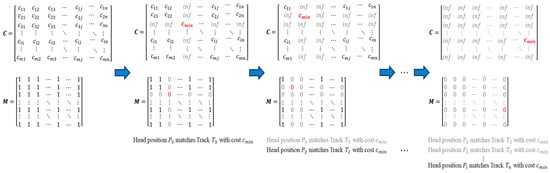 After obtaining the covariance matrix , we search the associated head position point and trajectory pairs with minimum distance. Unlike the conventional multiple global exhaustive search, we first define a binary mask with the same shape of and find the matching pair with minimum distance. The elements in are initialized as one. Once the head position point matches the trajectory, the row and the column of the mask are set to 0, and the corresponding value of the covariance matrix is set to infinity. In other words, these elements are considered as invalid areas and no longer involved in the subsequent processing. For the next iterations, only the valid areas are processed until all the elements in the mask change to 0. The procedure of computing the element in the covariance matrix and mask is shown in Figure 6. Finally, a filter result matrix with matching distance and index of corresponding matching trajectory is obtained. For each head position point, if the matching distance is less than the pre-defined threshold, the current point is merged into its corresponding trajectory. The remaining unmatched head position points are checked to see if they identify as the starting point of the new track by the counting strategy. Besides, the unassociated trajectories are temporarily disabled. The counting module will determine if the current track is in an ending state. The track assignment filter selects several true head positions to join the existing tracks. The filtering process is presented in the form of pseudocode below.