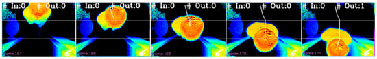 When the track assignment filter leaves unassociated trajectories, tracking state detection is used to determine whether the track ends or not. If no new head position point matches the current trajectory in three consecutive frames, the track no longer updates. Two criteria are defined for detecting the events of entering and leaving the scene. One is the consistency of movement direction. The trajectory needs to move in the same direction in general. The other is the principle of crossing the detection boundaries. The ending point of a track is supposed to meet the condition in Equation (10). If the two conditions are satisfied simultaneously, this trajectory can be used for flow estimation. Each effective trajectory represents the entry or departure of a person. The direction of entering and leaving is determined based on the coordinate difference between the start and end positions. Figure 7 shows the counting process for the people flow estimation.