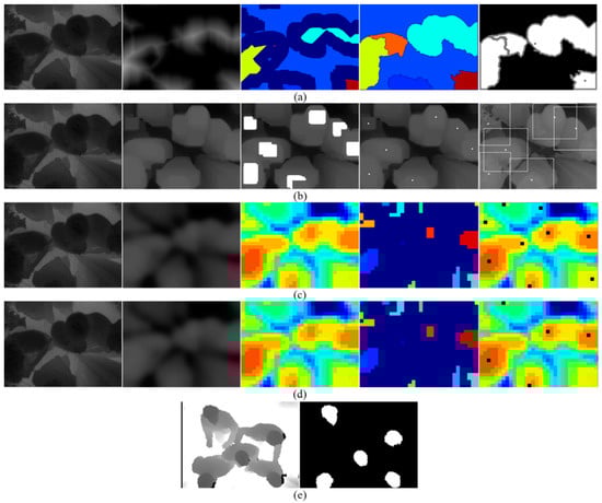 The results of different human detection methods for the same input depth image in our dataset. The input is a typical multiple people scene with occlusion, where five persons in total move in different directions. (a) Visualization of processing and results combined with distance transformation and watershed algorithm; (b) head central location points clustering based on local maxima search; (c) the proposed human detection method based on local pooling and searching; (d) the proposed approach combined with classification refinement removing false positive candidates; (e) head segmentation results based on convolutional network U-Net3.