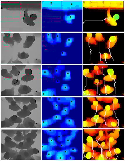The depth images in the TVHeads dataset are captured by Kinect, a kind of TOF camera. Due to the large installation height, it has a larger field of view. In other words, the TVHeads dataset provides images that accommodate more people in the scene. In our proposed dataset, the TOF camera is mounted on the door with a lower installation height and a smaller field of view. Therefore, the TVHeads dataset is just complementary to our dataset implementation. It is used to evaluate the performance of our approach for large field-of-view scenes. Figure 10 shows the experimental scenario from single person to multiple people and from simple scene to complex scenes on the TVHeads dataset. Examples of our dataset are shown in Figure 11. Black points in the middle column represent the human positions. Besides, white trajectory lines in the right column show the tracking results by flow estimation module. The experimental results show that in the single person walking scenes, or multi-people walking crowded together with physical contact and occlusion scenes, our proposed algorithm demonstrates robust and outstanding performance in human detection and flow estimation. Thus, the proposed approach outperforms other existing methods with the highest accuracy and fastest running time validated in different datasets.
