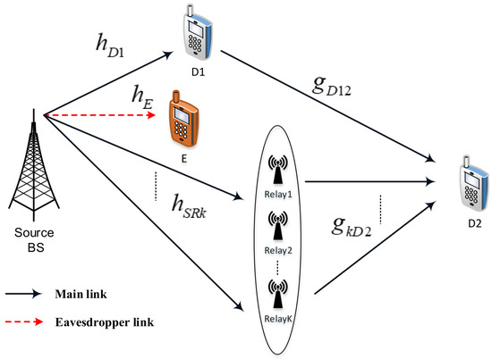 where . From here to following sections, we denote , , , , as channel gains of links BS-D1, D1-D2, BS-Rk, Rk-D2, BS-E respectively. Here, denotes the target data rate of D1.
